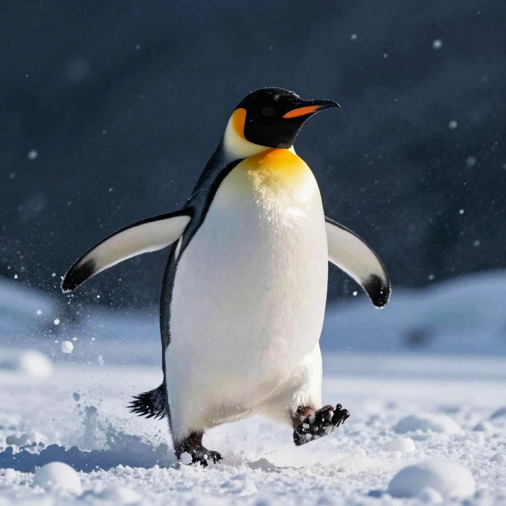 (masterpiece, best quality, hires, high resolution:1.2), extremely detailed, professional shot of (funny penguin, running from snowstorm, (full length, open beak:1.2), highly detailed), (night arctic background:1.2), fixed pose), slow motion, pov, high quality, masterpiece, cinematic, realistic, highres, (cinematic dark lighting, close up, cinematic exposition, snow explosion, snow splash)