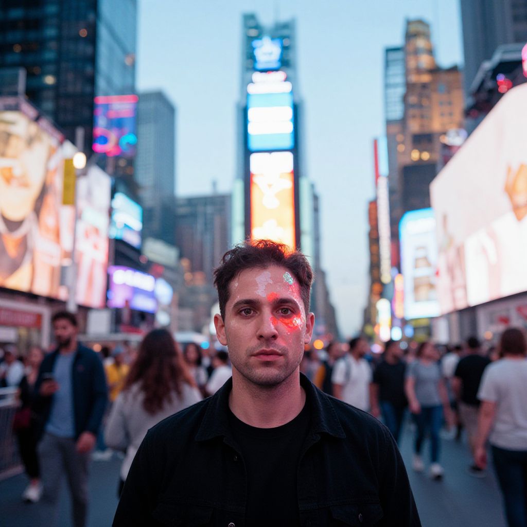 Vibrant urban scene: A solitary figure stands amidst the energetic throngs of Times Square at dusk, enveloped by an ethereal ambiance, as neon signs and billboards radiate a kaleidoscope of colors, their reflections dancing across his face, capturing the essence of this iconic New York City landmark. Man has masculine face and piercing eyes