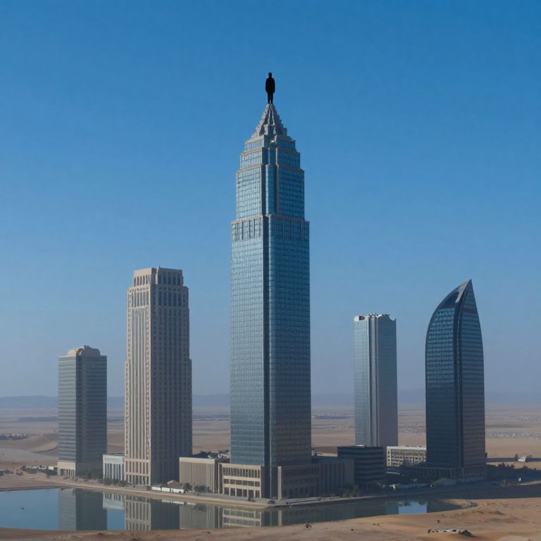 Photograph of a modern cityscape under a clear blue sky. Central focus is a tall, glass skyscraper with a black silhouette at its peak, flanked by four other high-rise buildings of varying heights and designs. The tallest building has a pyramidal top, while the others have more conventional rectangular shapes. A small body of water reflects the buildings at the bottom of the image. The background features a flat, barren landscape stretching to the horizon. The image has a crisp, clean aesthetic with bright sunlight highlighting the glass textures and modern architectural styles.