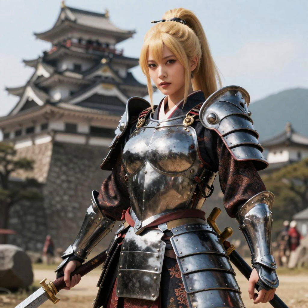 A female goddess with full armor, ancient Japan theme, tempting look, cleavage, full armor, kimono ((MILF)), (((masterpiece))), ((best quality)), ((intricate detailed)), ((Hyperrealistic)), a goddess with perfect body figure wearing armor, pale skin, (huge breast), highly detailed, illustration, 1 man, perfect hands, detailed fingers, beautiful detailed eyes, blonde hair, ponytail hair, (fantasy:1.2), armor, detailed background, ancient japan castle, looking at the viewer, from the side, midori