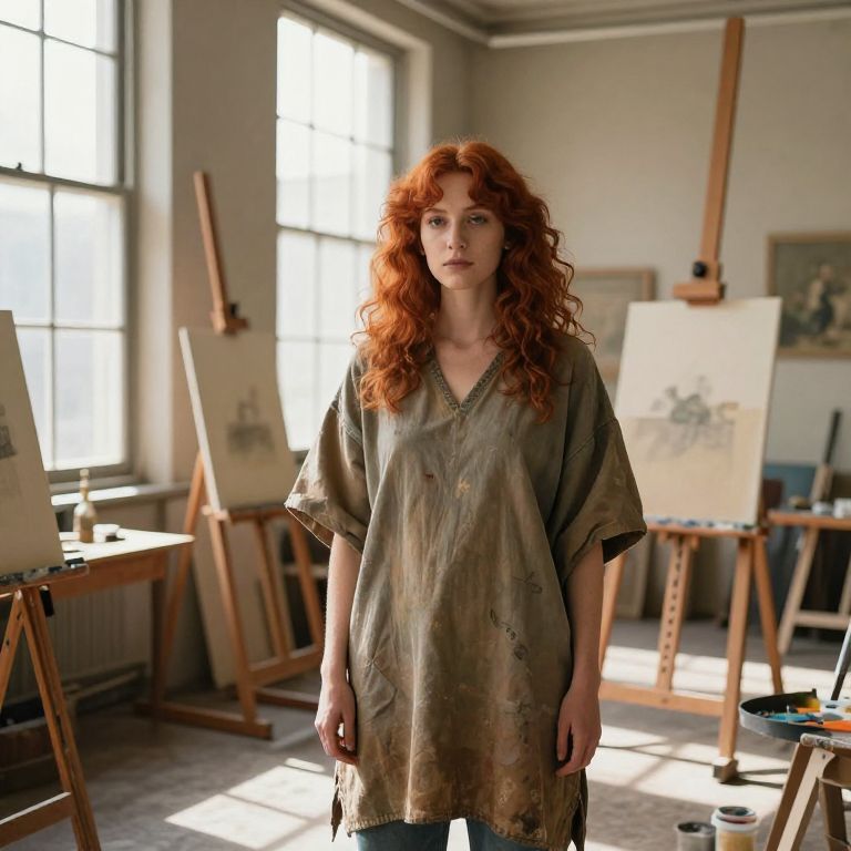 Photograph of a young woman with long, curly red hair standing in a sunlit art studio. She wears a loose, beige, slightly stained tunic with short sleeves. The studio has large windows on the left, wooden easels with blank canvases in the background, and a painting partially visible on the right. The floor is covered with a checkered mat, and there are paint supplies on a small table in the foreground. The light creates a warm, natural glow, highlighting her pale skin and delicate features. The overall atmosphere is artistic and serene.