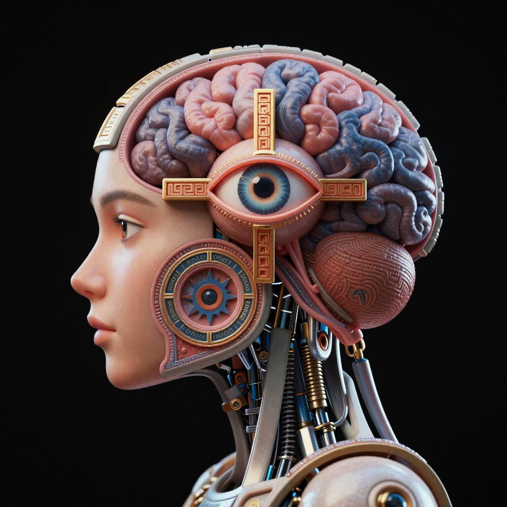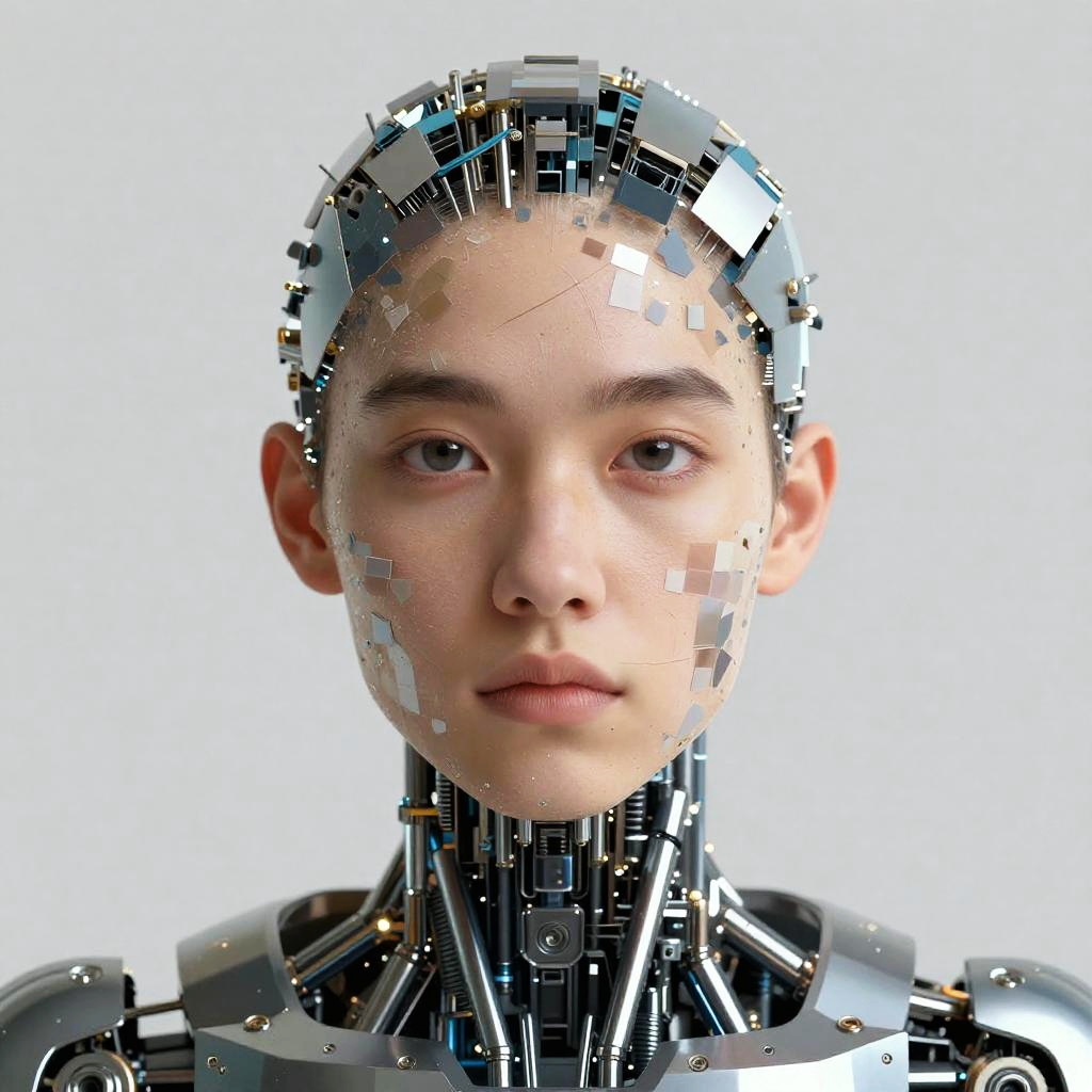 Futuristic mosaic AI artwork, mosaic patterns made of tiny circuit boards and glowing AI nodes, arranged to resemble a human face, cyberpunk aesthetic, vibrant colors, digital art style