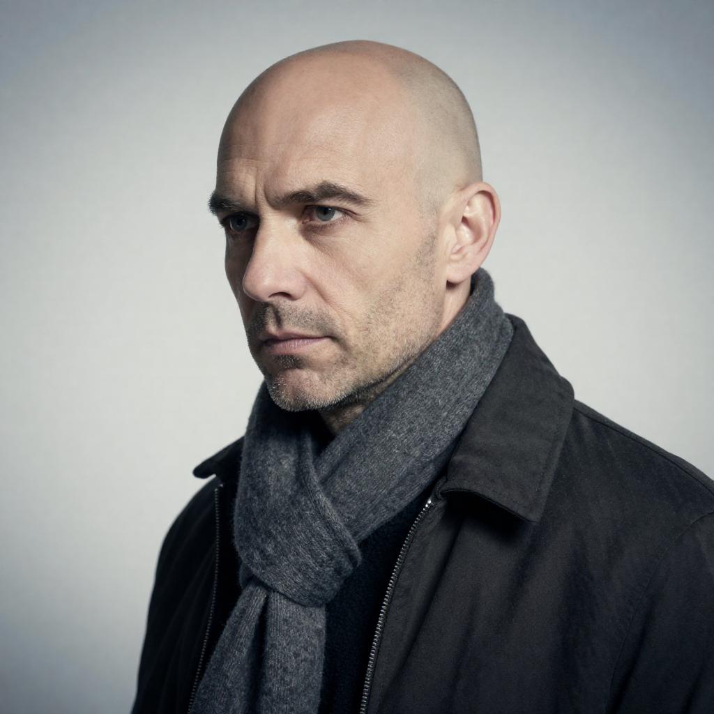 Photograph of a bald middle-aged man with a serious expression, wearing a black shirt with a white collar, set against a blurred background of bookshelves filled with colorful books. His skin is fair, and he has light stubble on his face. The lighting is soft, highlighting his facial features.