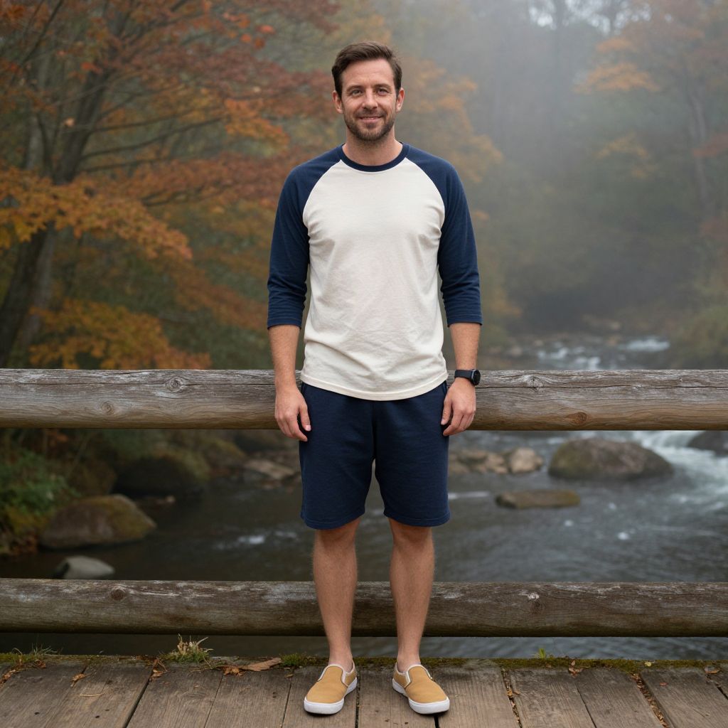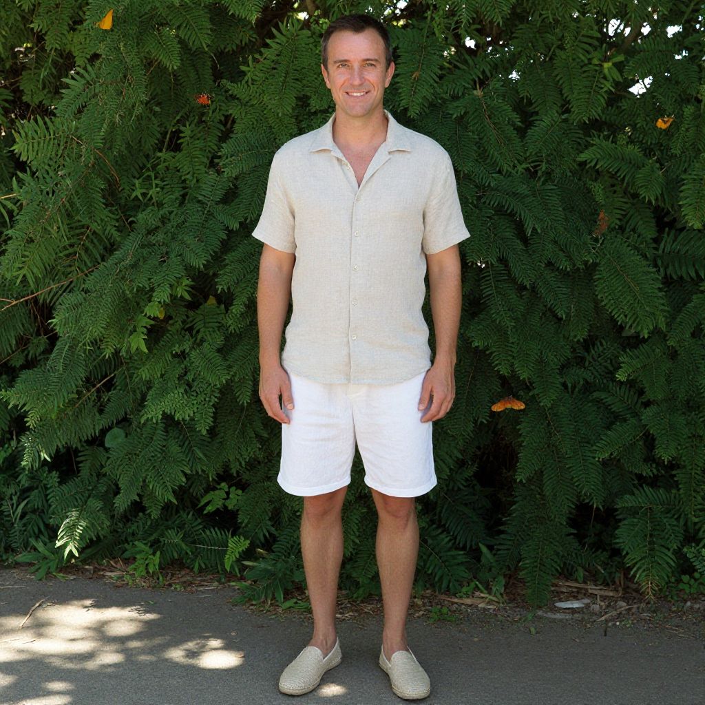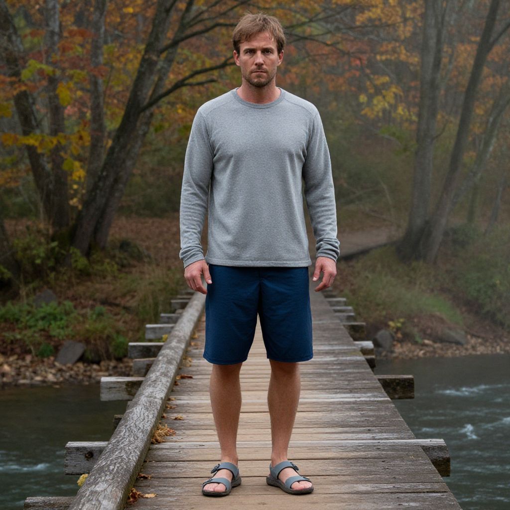 Photograph of a middle-aged man standing in a forest. He has short dark hair, a trimmed beard, and light skin. He wears a long-sleeved, orange and black striped shirt, black knee-length cargo shorts with a white drawstring, and black sandals. The forest background is dense with tall trees, green foliage, and dappled sunlight filtering through the leaves, casting shadows on the ground covered in pine needles and small plants. The man looks directly at the camera with a neutral expression. The photograph has a natural, candid style.