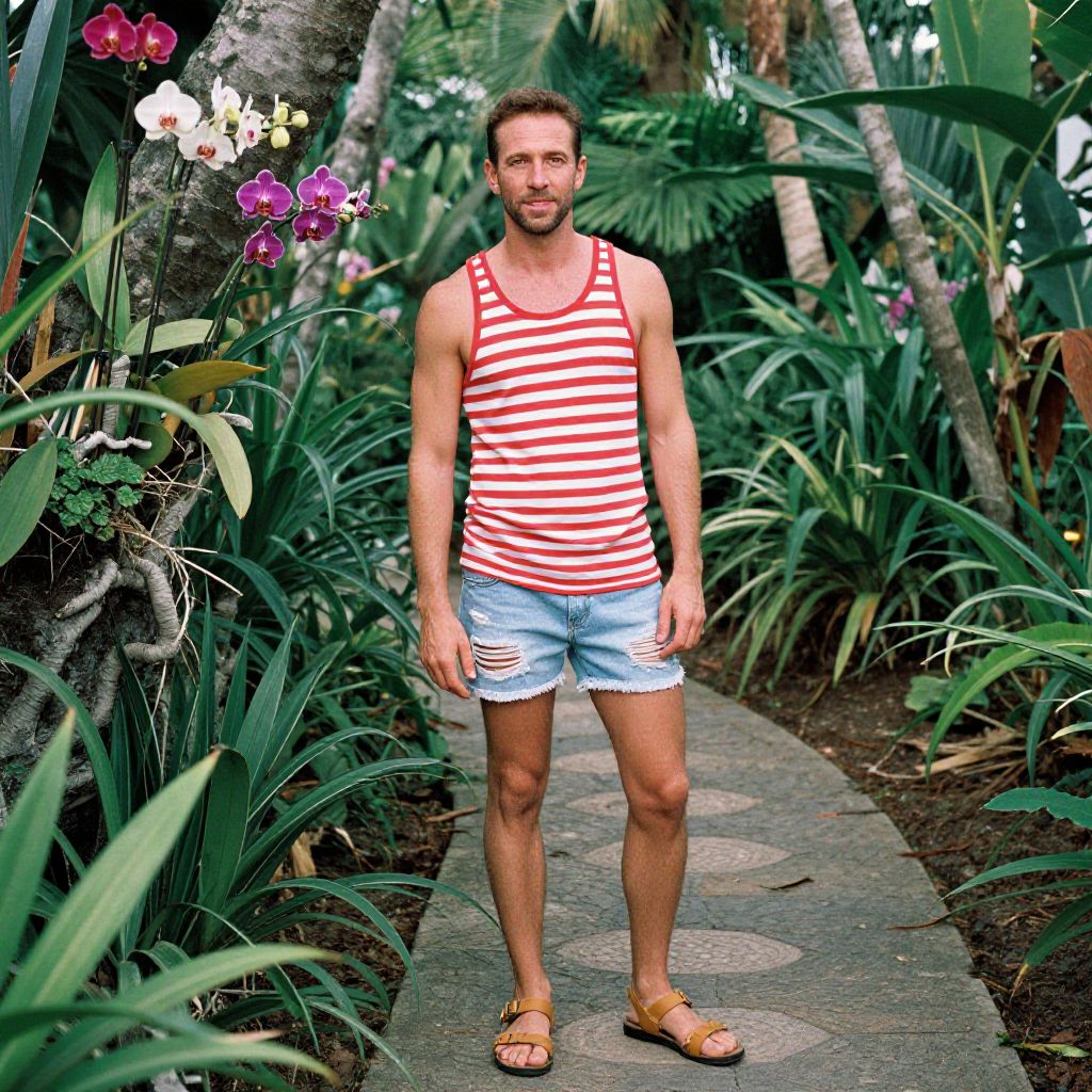 A man, long-sleeve rash guard, bold orange and navy stripes, cargo swim shorts, slip-on sandals, standing in a dense forest canopy, sun-dappled clearings, disposable camera style, relaxed expression, enjoying nature. Man has masculine face and piercing eyes