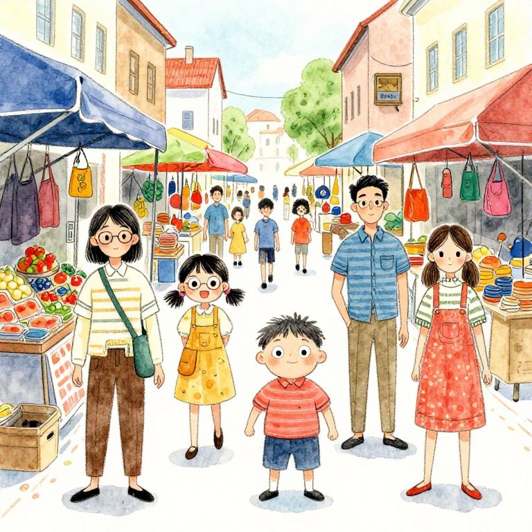 Hand drawn characters in a lively street market scene, vibrant colors, expressive faces, detailed line art, whimsical style, soft watercolor textures, dynamic poses