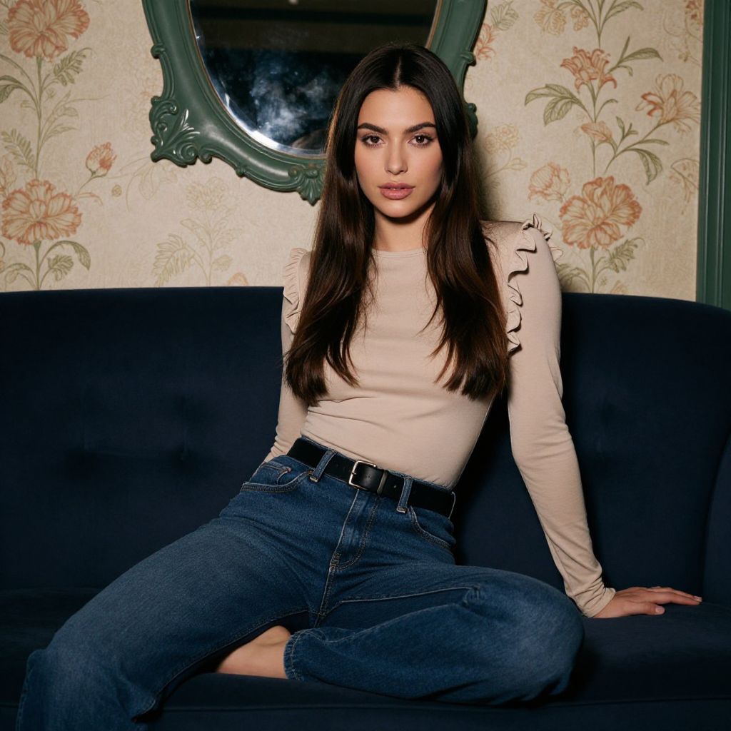 Photograph of a young woman with long, straight dark brown hair and light skin, sitting on a dark blue sofa in a dimly lit room. She's wearing a beige, ruffled long-sleeve top and high-waisted dark blue jeans, with a black belt. The background features a floral-patterned wallpaper and a vintage-looking, green-framed mirror. She has a confident expression and is slightly leaning back with one hand on the sofa.