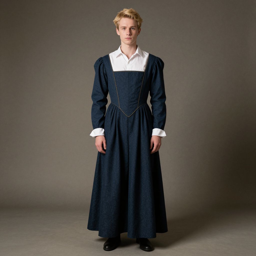 Adult renaissance dress, solo, 1boy, male focus, blonde hair, standing, full body, long sleeves, realistic, dress, looking at viewer, parody, white shirt