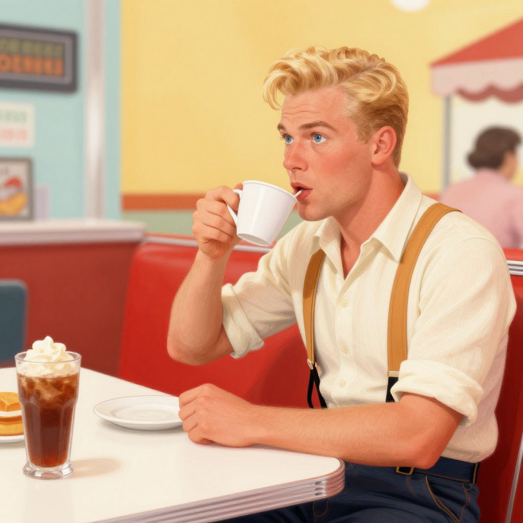 Blonde hair blue eyes men in a classic 1950s style diner scene, retro clothing with suspenders and rolled-up sleeves, vintage décor, sipping coffee and chatting, warm nostalgic mood, illustrated with soft brush strokes, colorful and lively