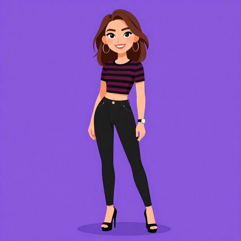 Woman with pretty face and pretty hair. smiling Woman, casual chic, horizontally striped crop top in maroon and black, short sleeves, high-waisted black skinny pants, decorative faux flaps at hips, peep-toe black platform heels, large wristwatch with black strap. --sref 1467