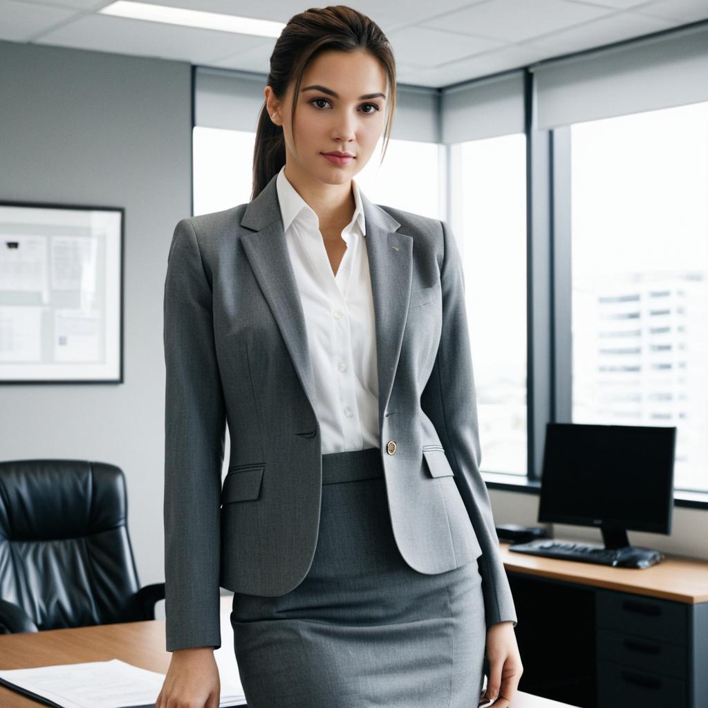 Suits office wear costume,1girl, solo, necktie, suit, realistic, brown hair, formal, blue necktie, long hair, brown eyes, pants, shirt, jacket, indoors, white shirt, looking at viewer, standing, grey jacket