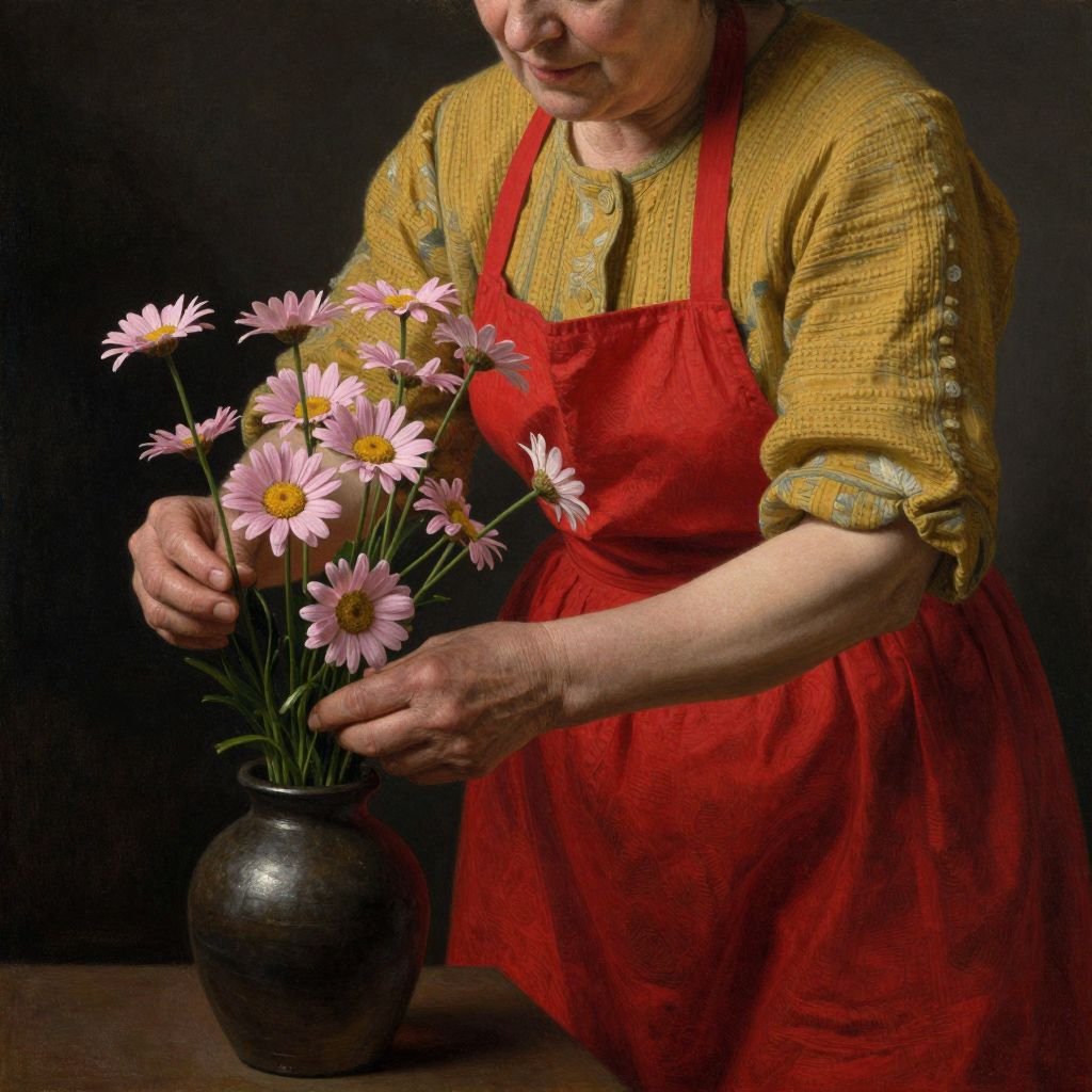 An elderly woman, dressed in a mustard blouse and vibrant red apron, tends to a vase of pink daisies with meticulous care, her hands gently adjusting the flowers against a dark backdrop, evoking the intimate realism and detailed brushwork characteristic of Gerrit Dou's \"Old Woman Watering Flowers\" (1660-65), rendered here in a modern interpretation with strikingly vivid colors and dramatic lighting.