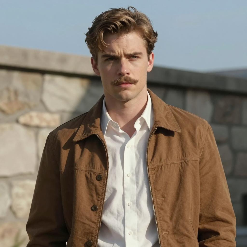 Walter white yellow outfit, photograph of young woman, front-facing, yellow jacket, white turtleneck, blonde hair in loose braid, small earrings, neutral expression, soft sunlight, blurred urban background, daytime, clear blue sky, natural light, realistic style, shallow depth of field, medium shot, casual outfit, slight shadow on face