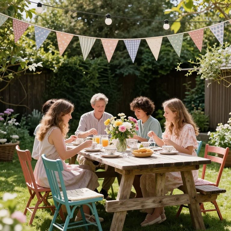 Twee style garden party at a sunlit backyard, string lights overhead, handmade bunting flags, rustic wooden picnic tables with mismatched colourful chairs, vintage teacups and plates, people in soft pastel clothing, flowers in bloom, a nostalgic and joyful setting
