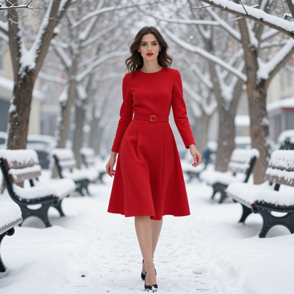 Photograph of a young woman with fair skin and wavy dark brown hair, walking down a snow-covered urban park pathway. She wears a vibrant, knee-length, long-sleeved red dress with a belt and black high heels. Her red lipstick matches her dress. The background features snow-covered benches and trees with bare branches. The scene is bright, with a contrast of red dress against the white snow, creating a striking visual. The woman's confident stride and direct gaze add a sense of poise and elegance.