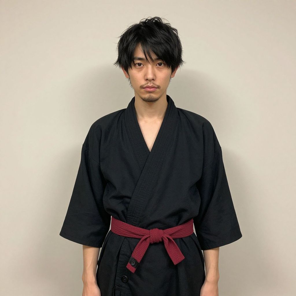 Photograph of an East Asian man with medium skin tone and black, slightly messy hair, standing against a plain white background. He wears a black kimono-style robe with a deep V-neck, tied with a maroon obi belt at his waist. His expression is neutral, with slightly parted lips and direct eye contact with the camera. The robe's fabric appears slightly textured, and the obi has a subtle woven pattern. The lighting is even, highlighting his face and the robe's texture. The overall style is simple and minimalist, focusing on the subject's attire and expression.
