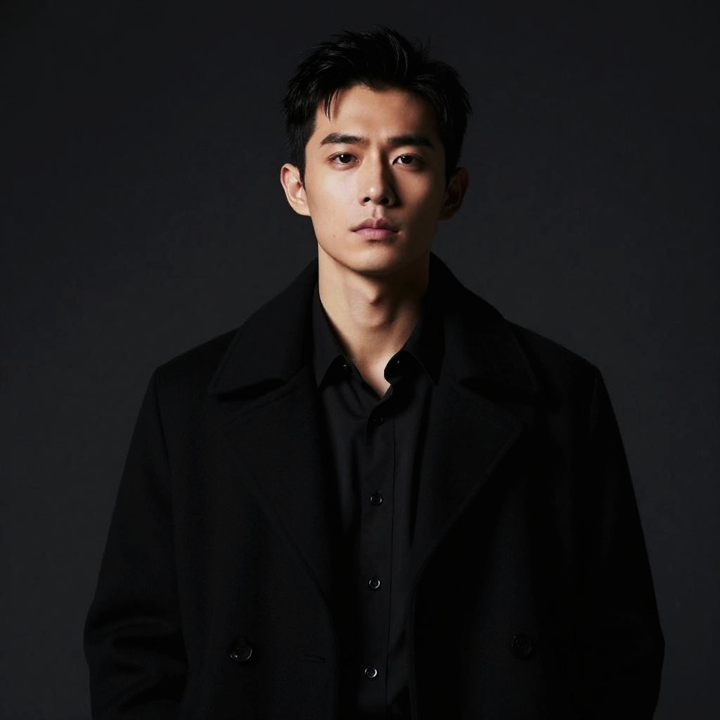 Portrait of a confident young Asian man wearing a tailored navy blue suit paired with a sleek black shirt, standing against a solid dark background. The image highlights contemporary men's formal fashion with a polished and modern look.