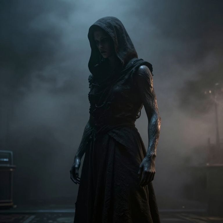 In a dimly lit, fog-filled room, a solitary figure stands with a haunting presence. The figure, cloaked in a dark, textured garment, is illuminated by a soft, ambient light that casts an eerie glow on its form. The skin appears photorealistic, with intricate details and a realistic texture that adds to the sense of depth and realism. The figure's pose is dynamic, with arms hanging loosely by its sides, exuding a sense of melancholy and introspection. The background is shrouded in thick fog, creating a dense atmosphere that enhances the surreal and dramatic effect. The overall composition is cinematic, with a professional processing that highlights the fine details and textures, making the scene appear almost like a still from a high-quality editorial photoshoot. The interplay of light and shadow, combined with the textured skin and dynamic pose, creates a powerful and evocative image that captures the viewer's attention.