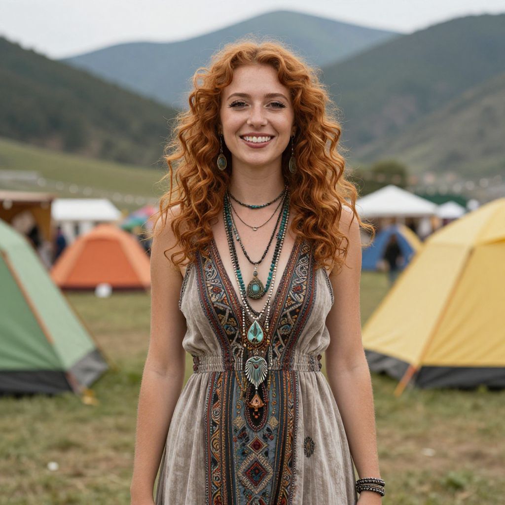 Portrait of a young Caucasian woman with curly red hair wearing a sleeveless bohemian-style dress with intricate patterns. She is accessorized with multiple layered turquoise necklaces, matching earrings, and bracelets. The background features colorful camping tents and a mountainous landscape, suggesting an outdoor festival or gathering in a natural setting.