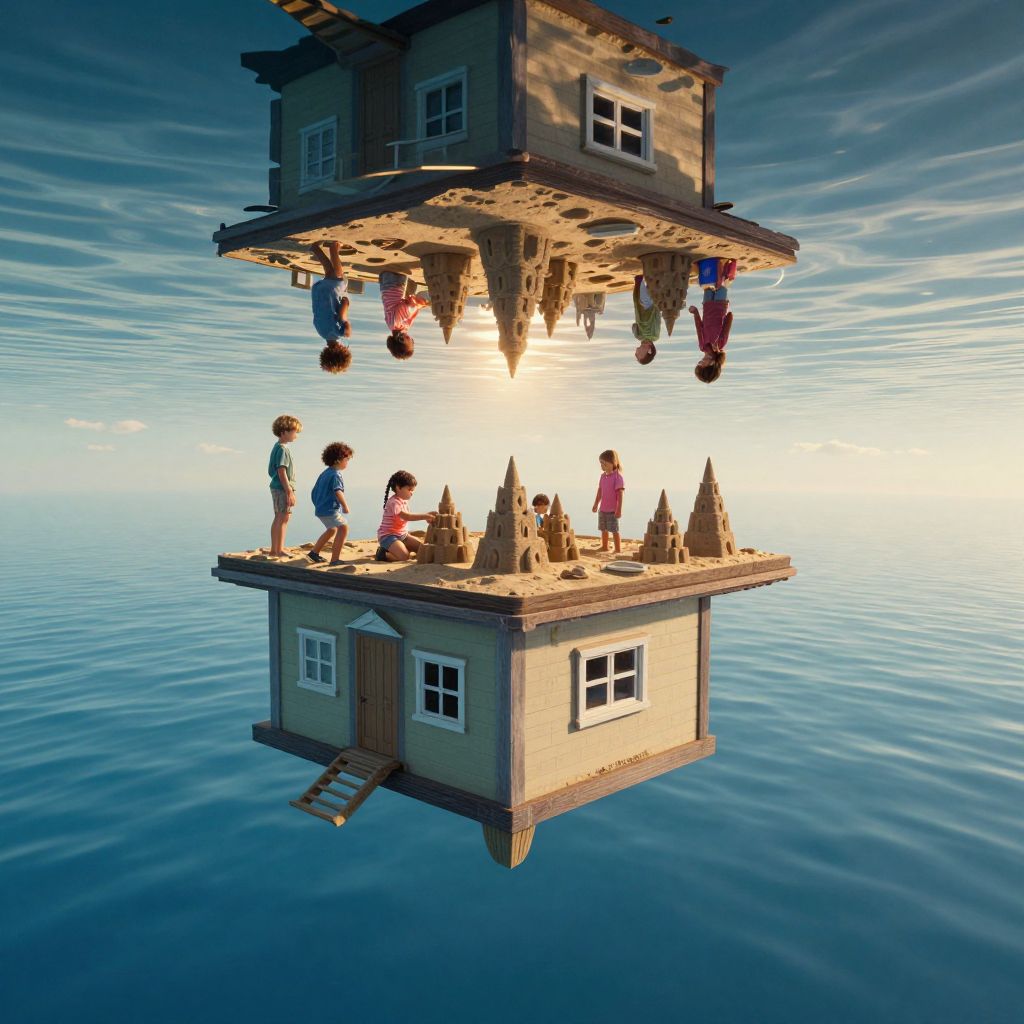A surreal, computer-generated fantasy scene depicts children building sandcastles on the inverted ceiling of a floating, upside-down house suspended beneath a tranquil ocean, illuminated by ethereal golden-hour sunlight filtering through the deep blue waters.