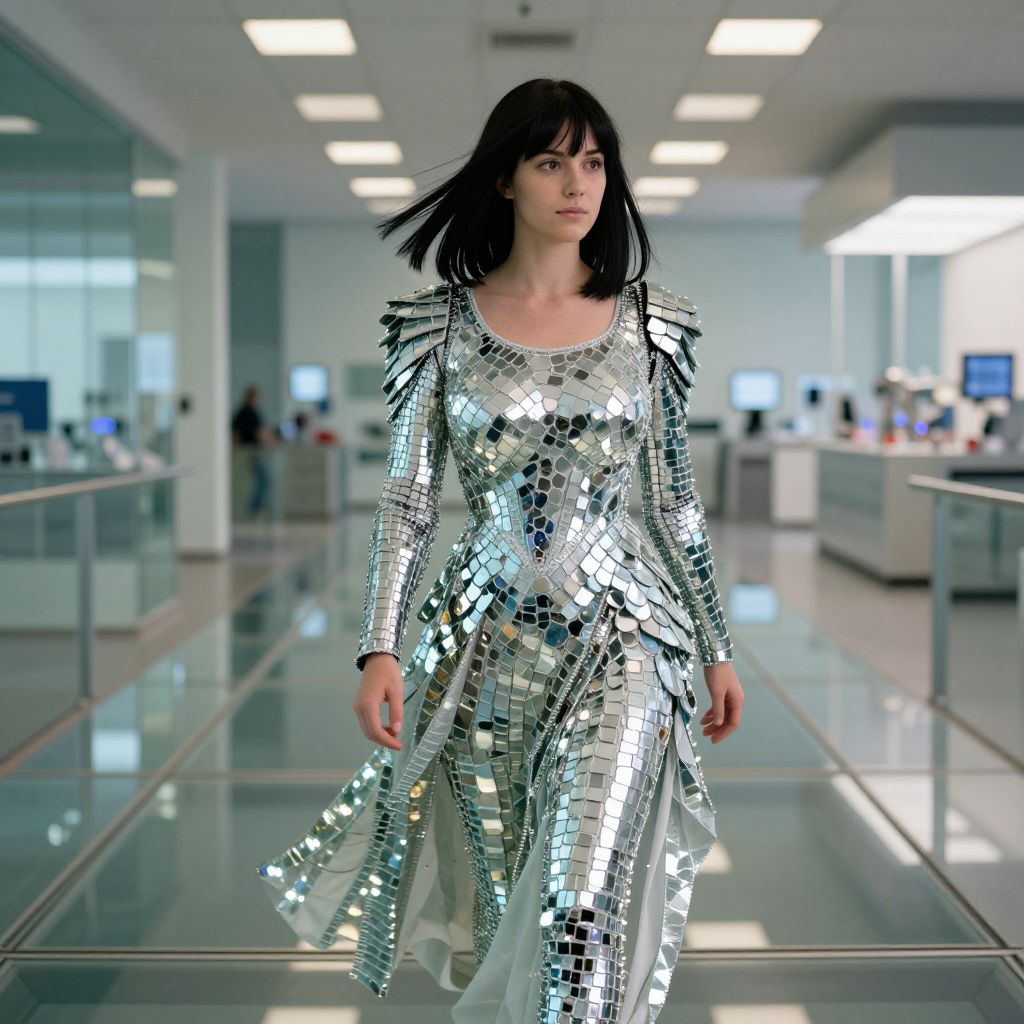 Photograph of a woman with black hair, wearing a silver, reflective, long-sleeve, mirror-tile dress, walking in a modern,