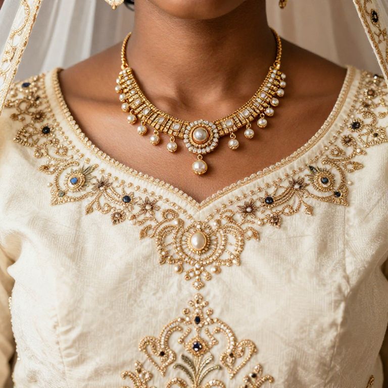 Photograph of a woman's upper torso, showcasing a traditional Indian outfit. She wears a cream-colored, embroidered blouse with intricate gold and blue threadwork on the neckline and shoulders. Her necklace is a detailed, gold statement piece with a central oval pendant and dangling pearls. The woman's skin tone is dark brown, and her face is partially out of frame. A sheer, gold-embroidered veil drapes over her shoulders. The background is blurred, emphasizing the detailed textures and colors of the blouse and jewelry. The overall style is elegant and traditional.