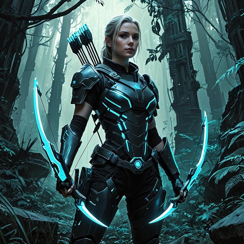 Portrait of a cybernetic forest ranger wearing bioluminescent carbon-fiber exoskeleton with glowing green veins in ancient techno-jungle lit by ethereal light, with a dramatic sci-fi-fantasy atmosphere, highly detailed digital painting, concept art, sharp focus, trending on ArtStation, illustration by Artgerm, Greg Rutkowski and Magali Villeneuve.