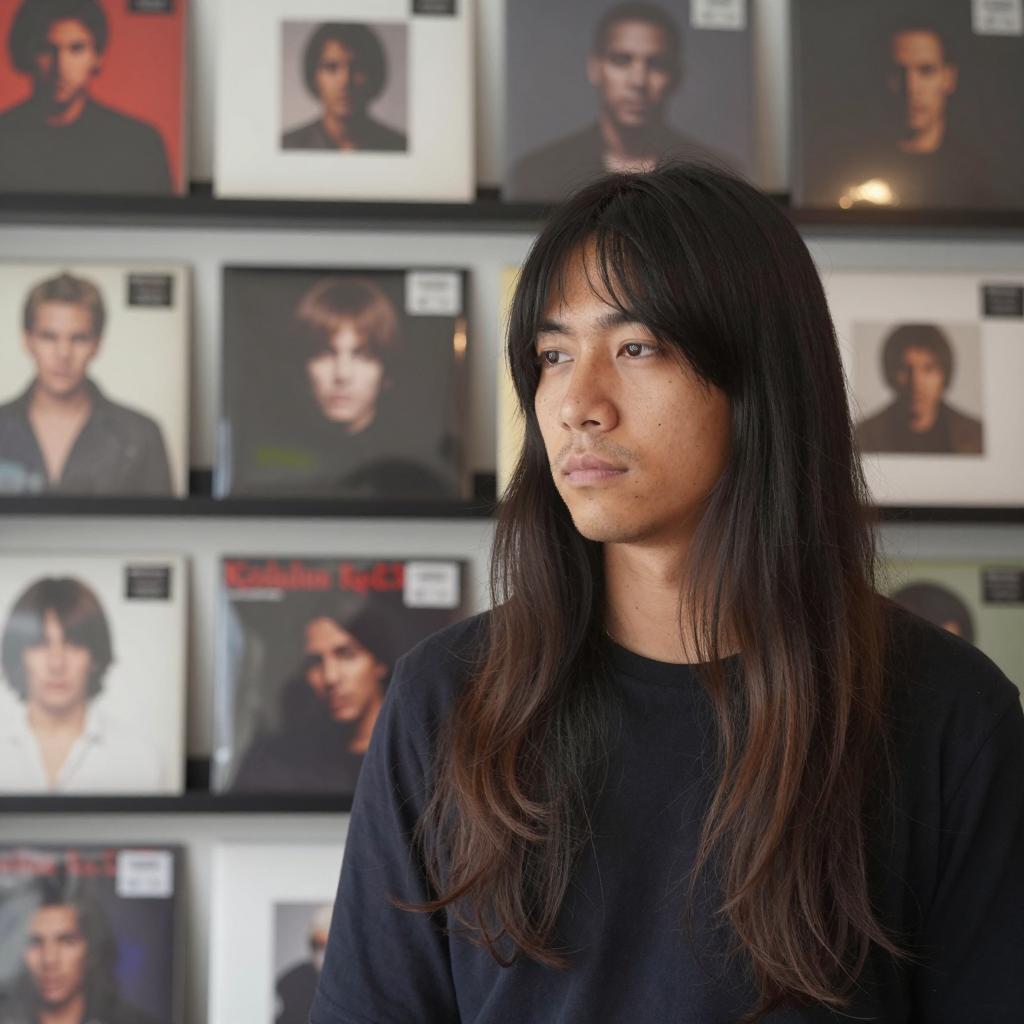 A man with long, straight hair and bangs, wearing a dark shirt, standing in front of shelves filled with album covers. Album covers feature various male faces and . Man has neutral facial expression, looking slightly to the left. Shelves are densely packed with albums, arranged vertically and horizontally.