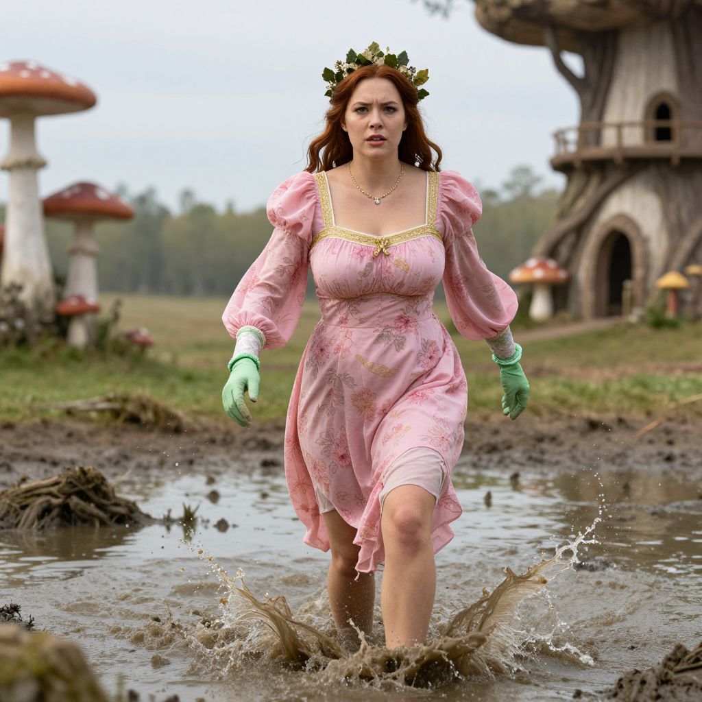 Photograph of a fair-skinned woman with brown hair wearing a pink, floral-patterned, medieval-style dress with puffed sleeves and green gloves. She has a green leaf crown and is splashing through a muddy puddle, with water splashing around her feet. The background features whimsical, fairy-tale-like architecture with red-capped mushrooms and a large, treehouse-like structure. The scene is set in a lush, green, forested area with overcast lighting. The woman's expression is determined, and she is in the center of the frame, walking forward.