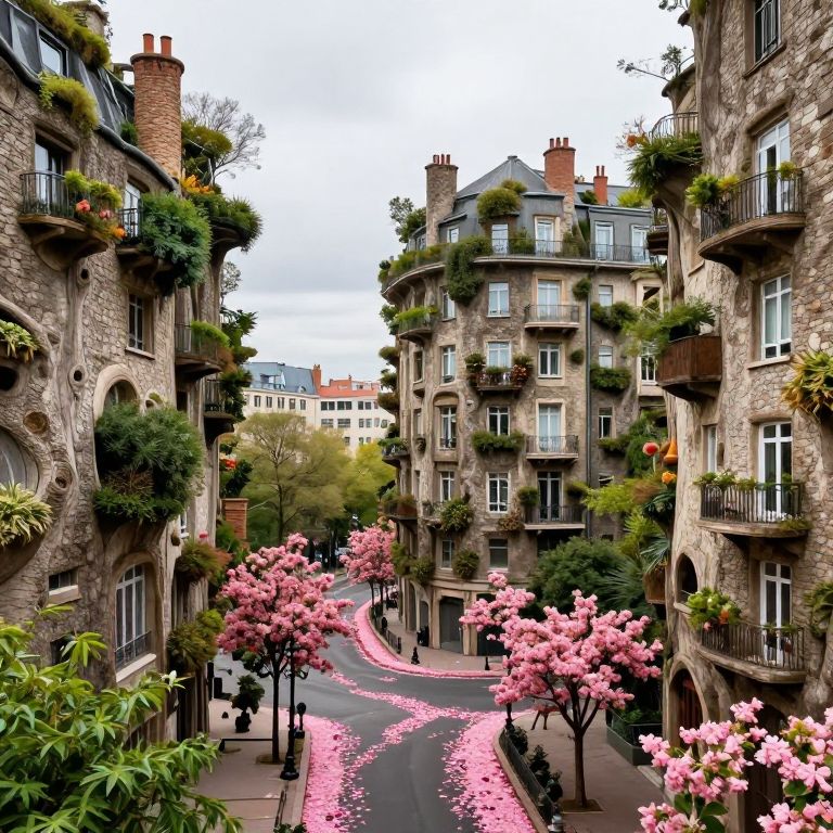 This vibrant photograph captures a narrow, picturesque street in a European urban neighborhood. Flanked by old, stone apartment buildings with arched windows and balconies adorned with greenery and potted plants, the street is lined with pink cherry blossom trees in full bloom. Their petals create a pink carpet on the curved asphalt road, leading into the distance. The buildings have a mix of rectangular and triangular windows, and some feature small chimneys. The sky above is overcast, contrasting with the bright pink blossoms. In the background, more buildings are visible, adding depth to the scene. The overall atmosphere is serene and charming.