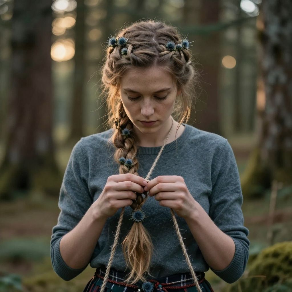 Scottish braids female weaving through ancient forest, delicate braids decorated with small thistles, mystical atmosphere, soft golden hour glow, cinematic composition, high resolution