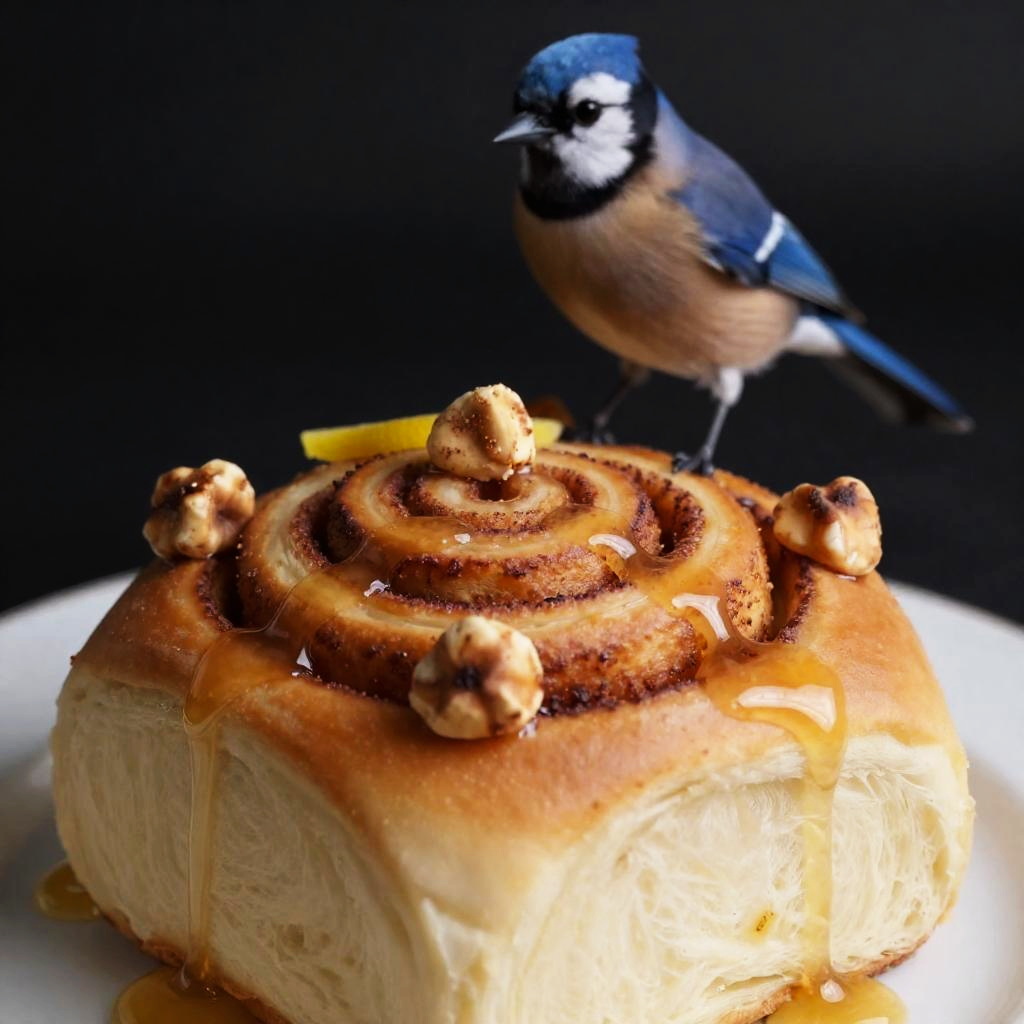 Close-up shot, realistic food, photorealistic, stack of buttermilk pancakes, bourbon-maple glaze with candied pecans and edible flower petals, goldfinch, detailed, depth of field, black background
