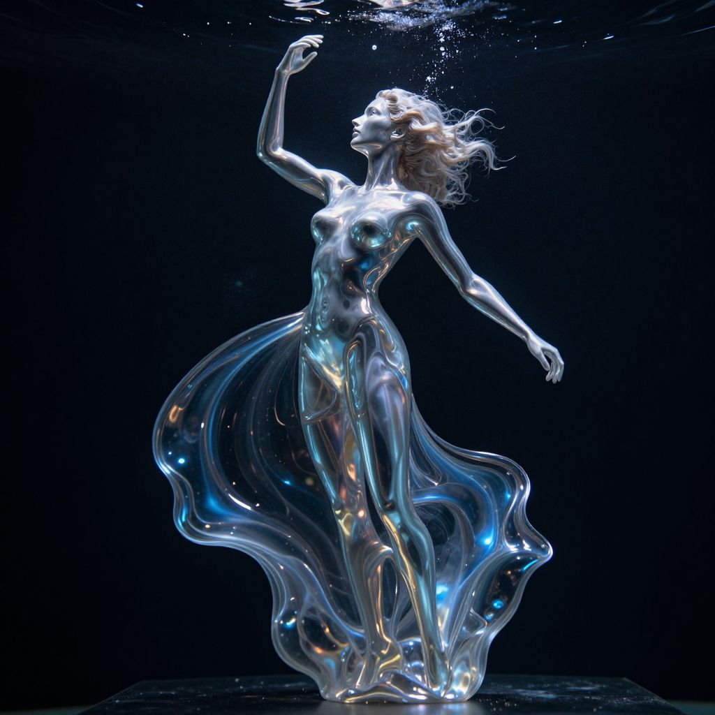 A dynamic sculpture of a woman made of Ferrofluid, with flowing, fluid-like movement and a dramatic, underwater effect.