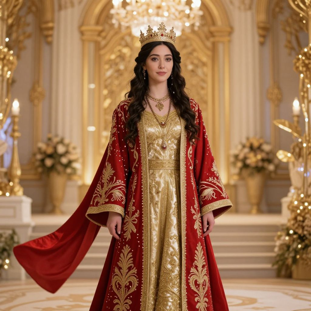 Arab girl dancing in a traditional dance outfit during a festive celebration, bright red and gold attire, lively music, vibrant lanterns in the background, cultural celebration scene, dynamic pose, realistic and expressive, MidJourney v6.