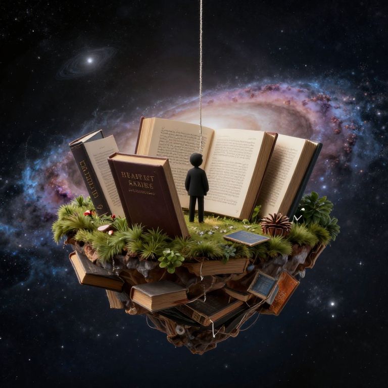 Digital artwork: Silhouette of person standing on floating, grass-covered book island with open books, surrounded by galaxy, suspended by string.