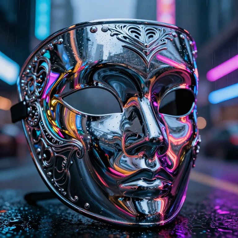 Close-up of a gleaming mask made of polished chrome and intricate filigree, reflecting a cyberpunk cityscape full of neon lights and rain-soaked streets, futuristic vibe with sharp contrast and reflections, ultra-realistic style.