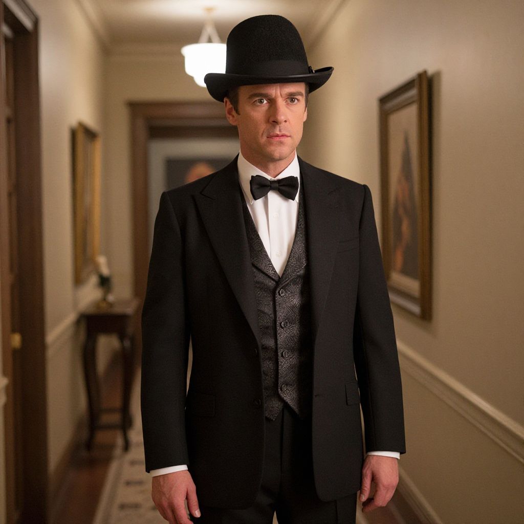 Photograph of a Caucasian man standing in a dimly lit, narrow hallway. He has fair skin, short brown hair, and is wearing a black bowler hat, black tuxedo with a white dress shirt, black bow tie, and black vest. His expression is serious and slightly stern. The hallway has cream-colored walls, wooden wainscoting, and patterned tile floors. Two framed paintings hang on the right wall, and a small wooden table is on the left. A bright ceiling light casts shadows, adding depth to the scene. The overall ambiance is formal and somewhat vintage.