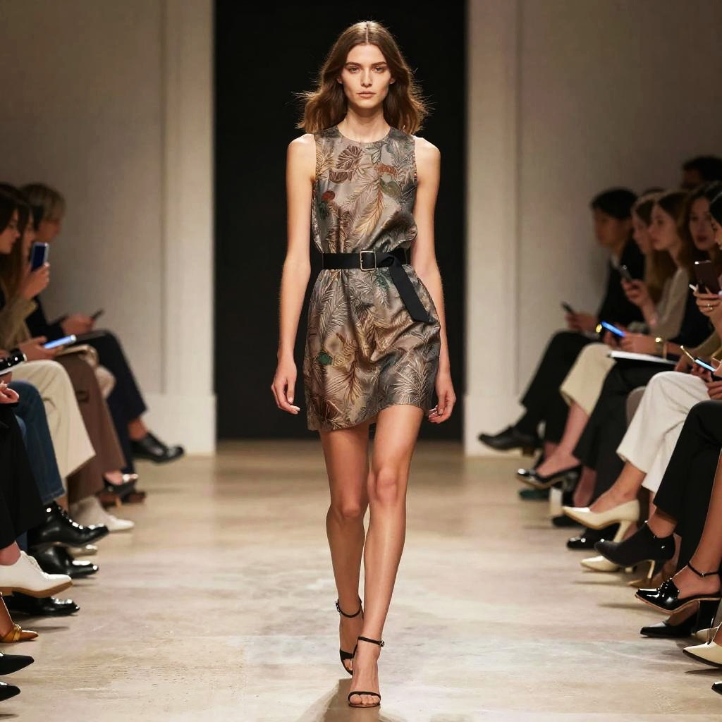 Slick Back Fade hairstyle on female model, wearing sleek satin gown, in runway, captured in fashion editorial style with bright tone.