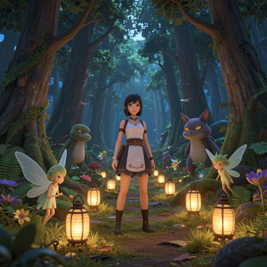 This digital CGI artwork depicts a fantastical forest scene at twilight. At the center stands a young woman with short black hair, wearing a white sleeveless top, black skirt with white trim, and black boots. She has a belt with a pouch and a wristband. Surrounding her are three small, fairy-like creatures with translucent wings and green hair, and two larger, cat-like creatures with glowing yellow eyes. The forest is dense with tall trees, moss-covered trunks, and glowing lanterns illuminating the path. Colorful flowers and ferns adorn the ground, adding to the magical atmosphere. The sky above is a deep blue, suggesting evening.