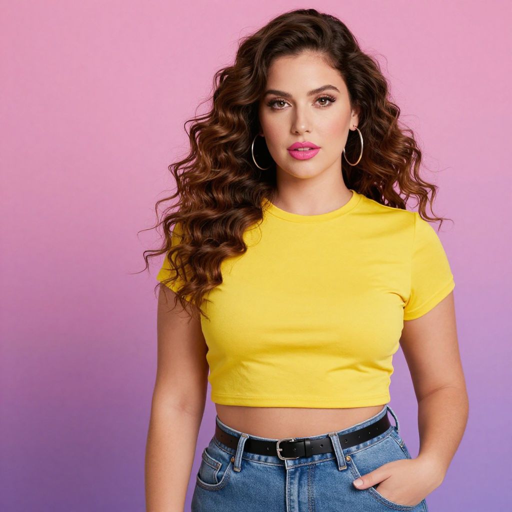 Photograph of a confident woman with voluminous, wavy brown hair and fair skin. She's wearing a bright yellow, short-sleeved crop top and high-waisted blue jeans with a black belt. She's standing with one hand in her pocket, sporting large hoop earrings. The background is a gradient of pink and purple, giving a vibrant, retro vibe. Her makeup is bold, with pink lipstick.