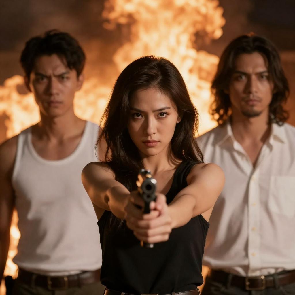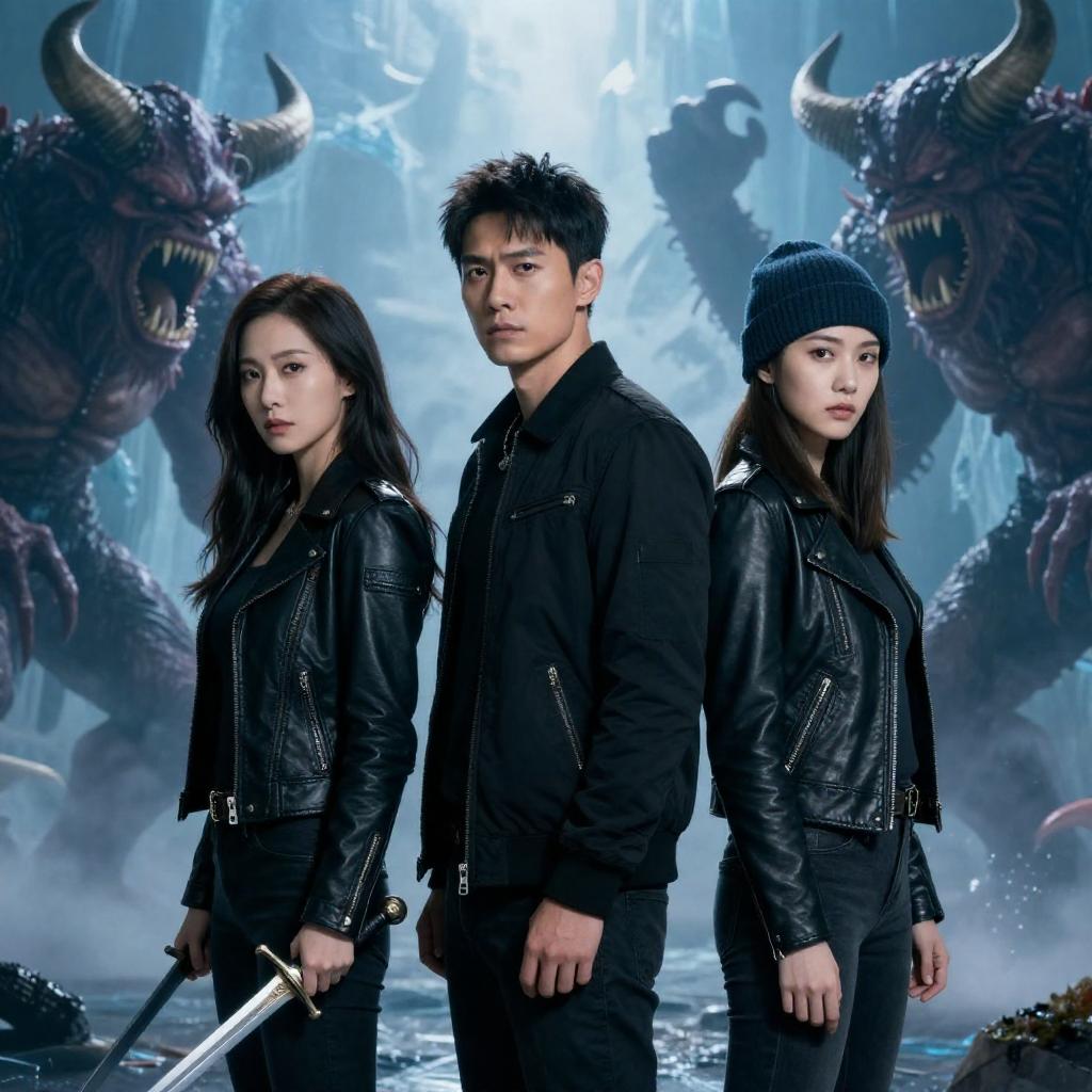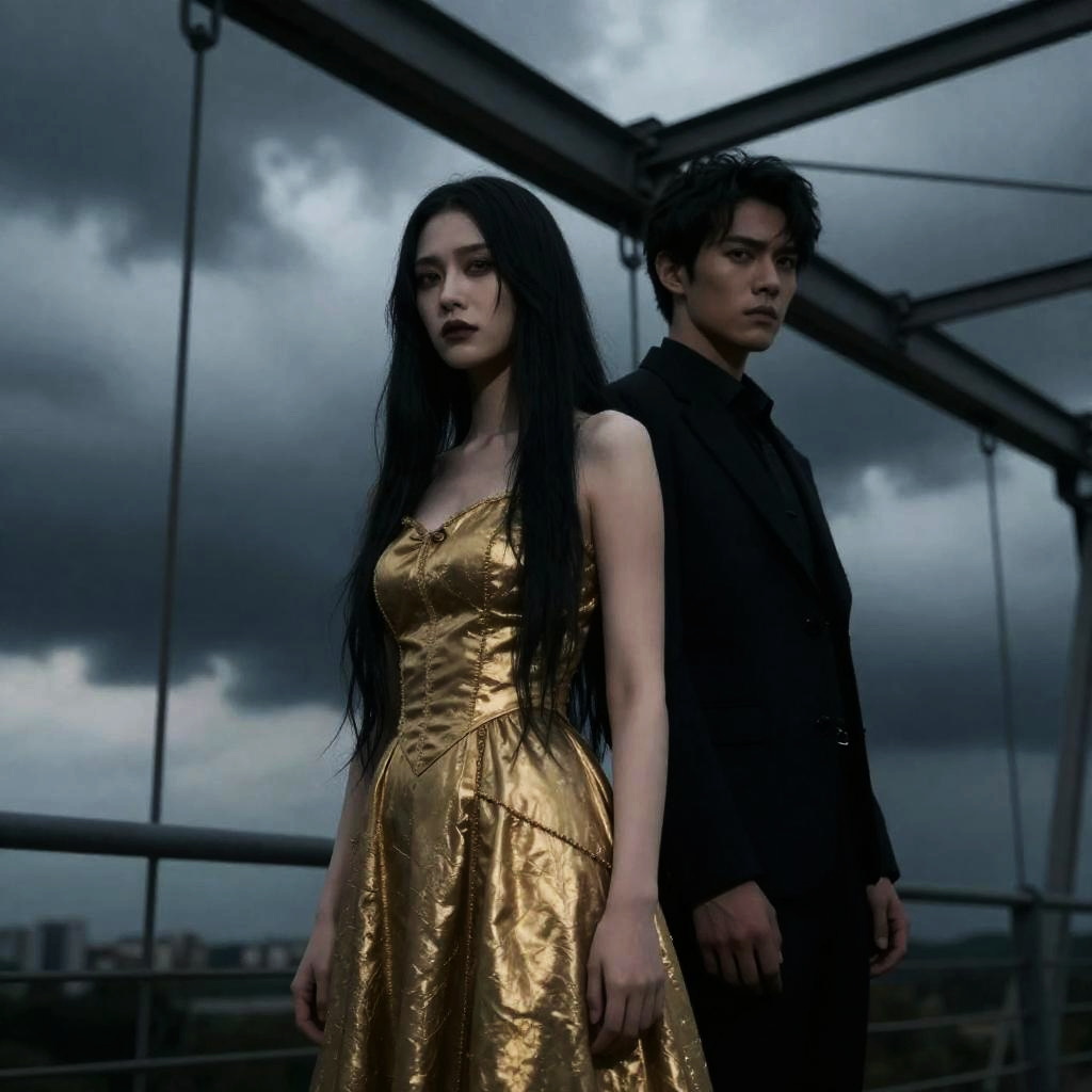 Photograph of an Asian woman and a man kneeling on a sandy floor in a dimly lit indoor setting. The woman wears dark brown leather armor with matching pants and arm guards, featuring long black hair and visible tattoos on her left arm. The man is dressed in a black leather jacket over a black shirt and dark pants, both with serious expressions. The background includes wooden chairs and a small table, suggesting a rustic or medieval-style room.