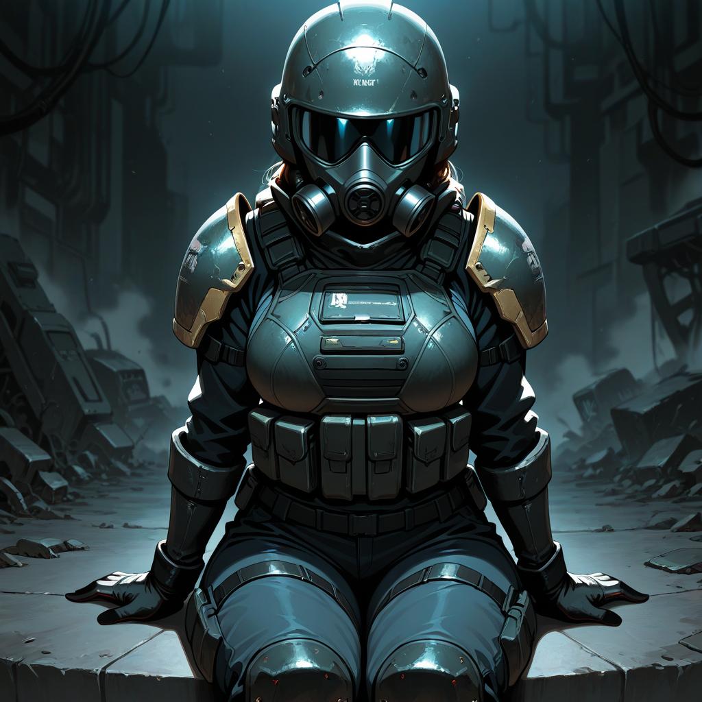 Combine assassin, 1girl, solo, helmet, faceless, gloves, looking at viewer, facing viewer, military, science fiction, gas mask, shoulder armor, armor, bulletproof vest, sitting, petite, breasts