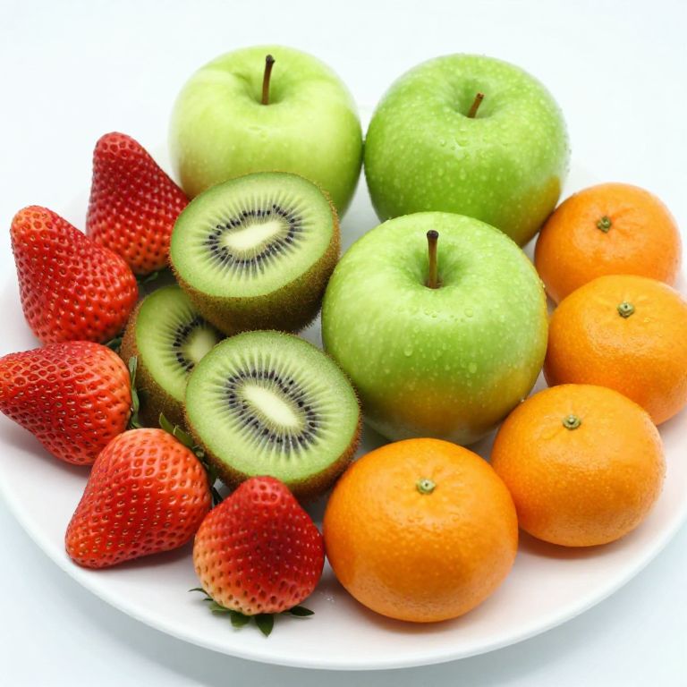 Vibrant assortment of fresh fruits, including whole strawberries, halved kiwis, green apples, and orange mandarins, artfully piled together on a white plate, showcasing a colorful and nutritious display.