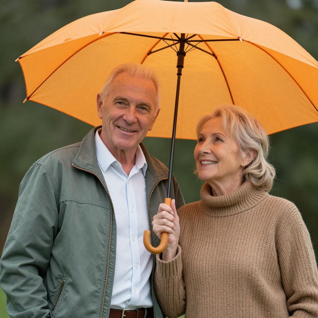 Smiling older couple sharing a vibrant orange umbrella, with the man wearing a green jacket over a white shirt and the woman dressed in a warm brown sweater, both radiating joy against a blurred green backdrop.