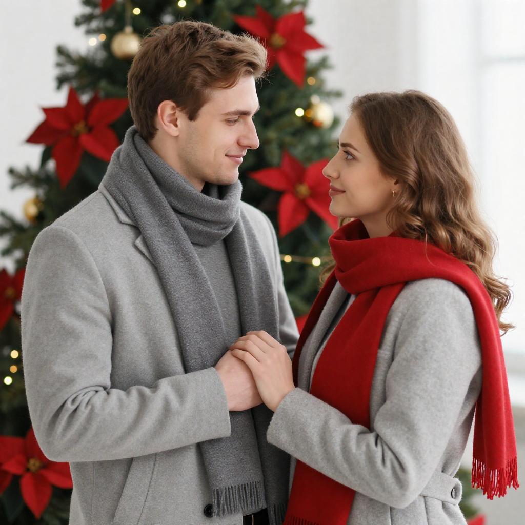 Photograph of a woman with straight brown hair, wearing a red cardigan, smiling at a man with short brown hair, wearing a gray shirt, standing in front of a decorated Christmas tree. Candlelit background, colorful ornaments on the tree. Woman's hands clasped near her chest, man's face slightly turned away. Both facing each other.
