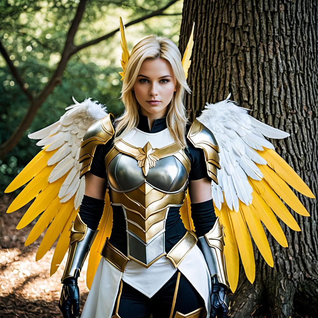 Woman with short blonde hair wearing a galaxy-themed blue leotard and matching gloves, posing outdoors with large white feathered angel wings. The character is styled in cosplay, standing in a natural, blurred forest background, wearing fingerless gloves and armor elements.