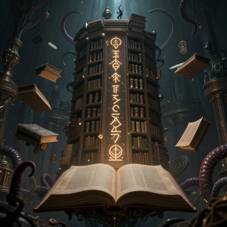 Mysterious dark tower with glowing runes, surrounded by floating books and tentacles, illuminated by blue light in a mystical library. Digital artwork.