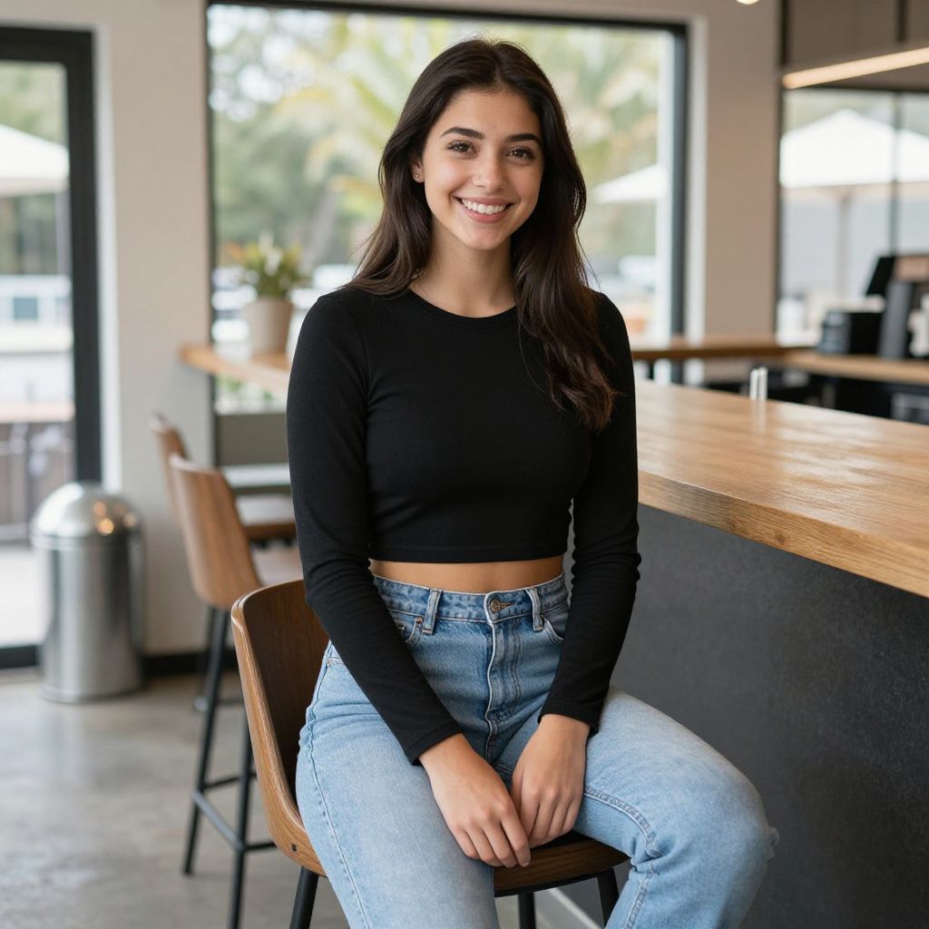 Photograph of a young woman with long, dark brown hair and a warm smile, sitting on a wooden bar stool. She's wearing a black, long-sleeve crop top that reveals her midriff and light blue, high-waisted jeans. The background shows a bright, indoor café with large windows, some greenery outside, and a metal trash can. The lighting is natural, and the floor is concrete.