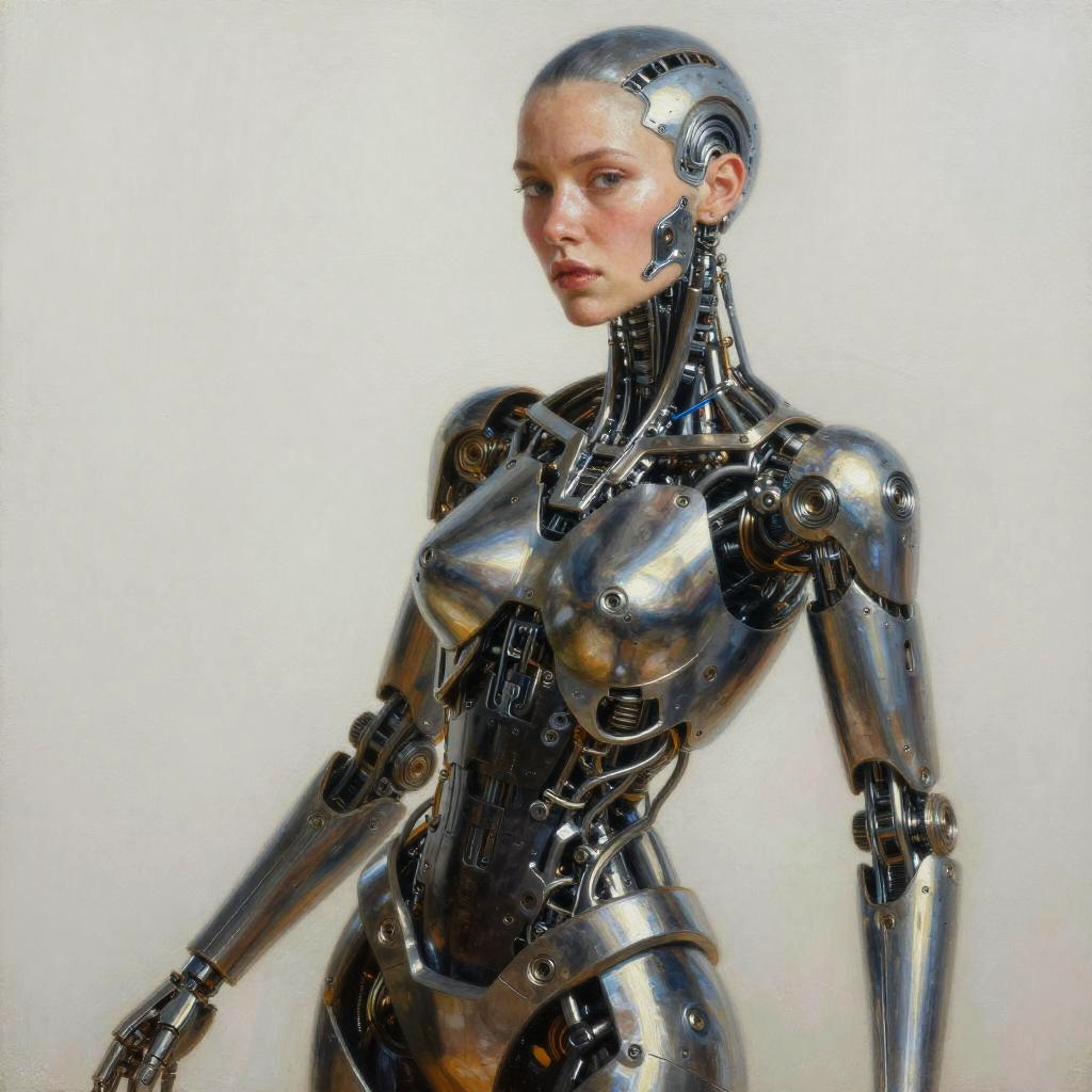 Nousr, a fine art painting of a beautiful woman, biomechanical, mshn robot, hyper realistic, steel, intricate design, insanely detailed, fine details, Extremely sharp lines, cinematic lighting, Photo realistic