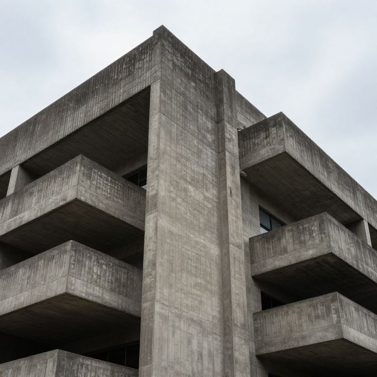 Brutalisme architecture showcasing massive concrete structures, sharp geometric lines, and raw textures under a cloudy sky, emphasizing the stark utilitarian beauty and monolithic presence in an urban setting, high detail, realistic lighting.
